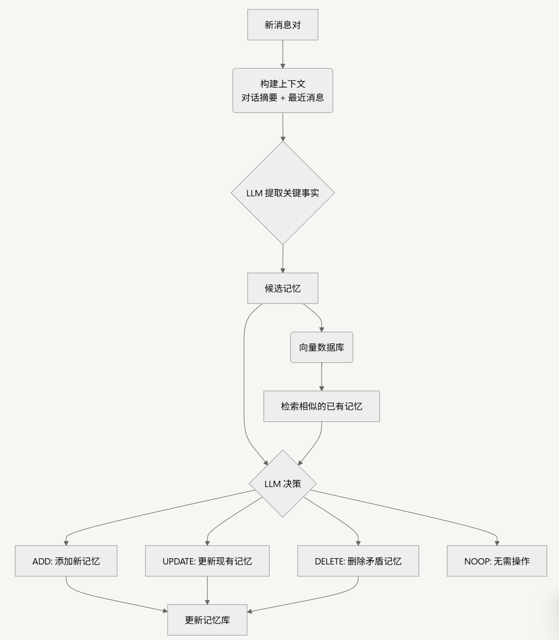 提取出的候选记忆并不会被直接存入数据库,而是会进入更新阶段,以确保记忆库的一致性和无冗余。该过程通过一个智能的“工具调用(Tool Call)”机制实现,具体流程如下: