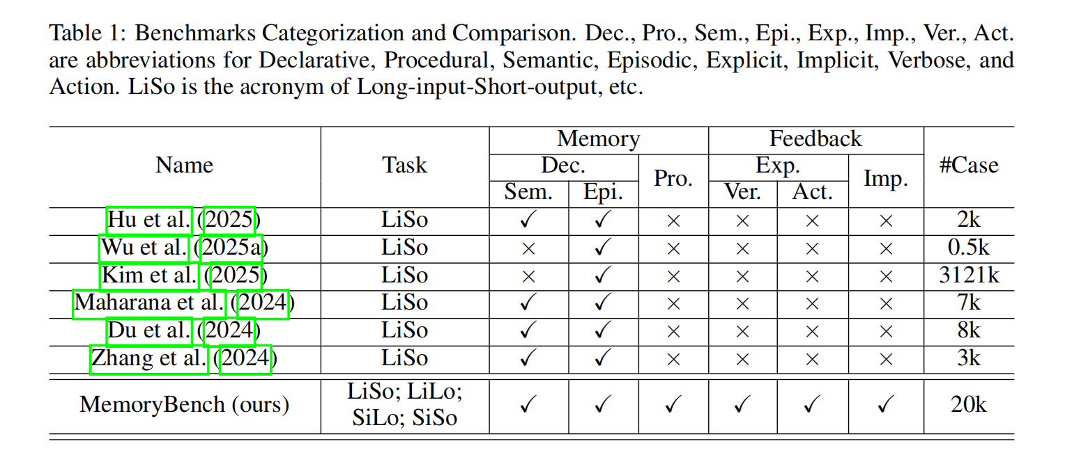 MemoryBench是第一个同时提供所有类型记忆和反馈数据的基准。