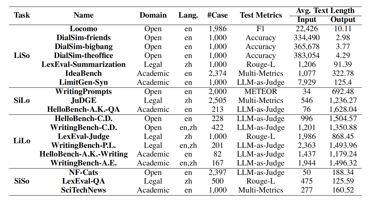 为了全面评估LLMsys的能力,论文从3个领域(开放域、法律、学术)、4种任务格式(LiSo, SiLo, LiLo, SiSo)和2种语言(中、英)中选取了11个公共数据集。