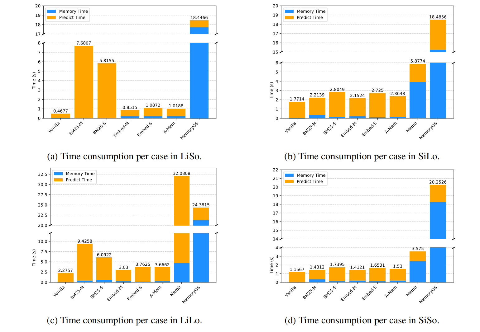 - Mem0 在处理长输入任务(如LiSo、LiLo)时内存处理时间较短,但在短输入任务(如SiLo、SiSo)时耗时较长。