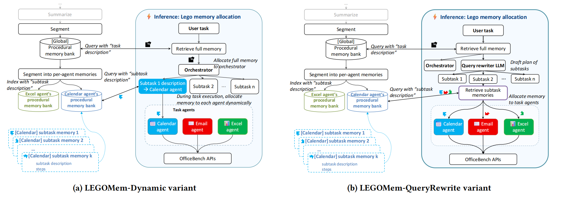 论文为了探究子任务检索粒度对多智能体系统的影响,提出了上文所述的对于任务智能体的三种变体。LEGOMem-Dynamic 和 LEGOMem-QueryRewrite 的工作流程如下图所示。
