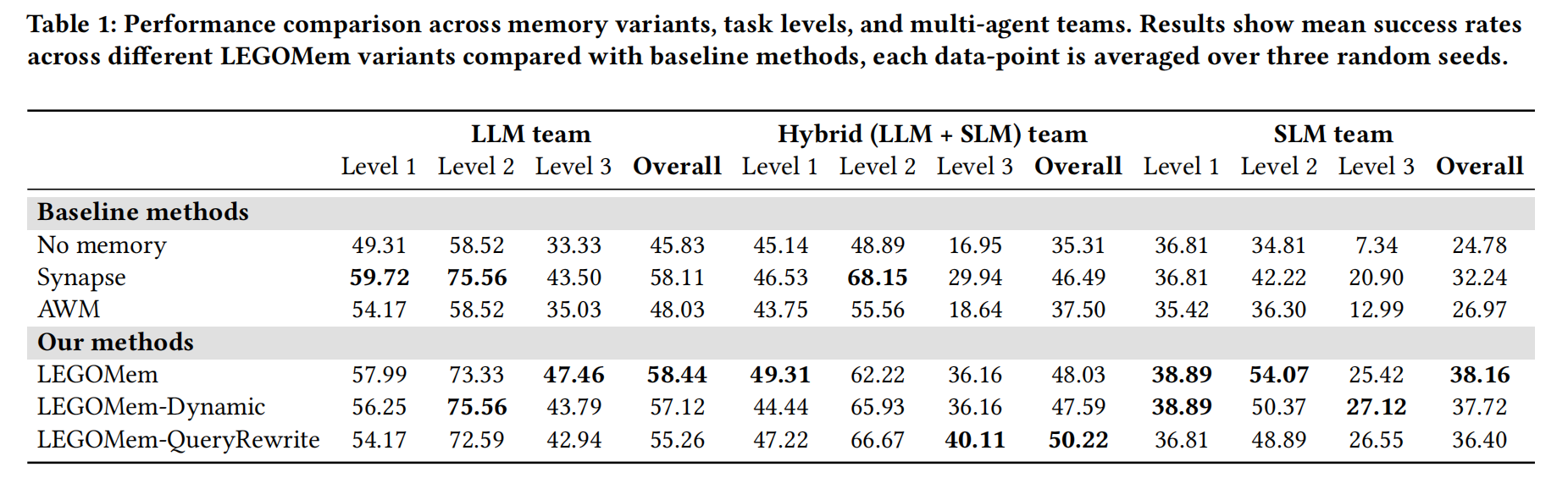 - Vanilla LEGOMem: 直接从协调器检索到的完整任务记忆中,“拆出”对应的子任务记忆,静态地预分配给各任务智能体。