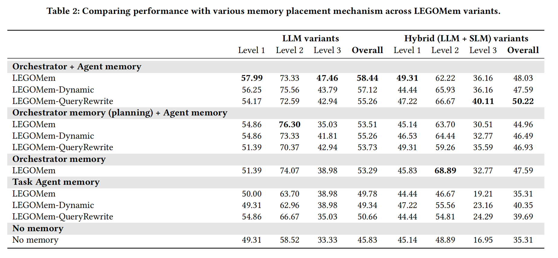 后续实验显示,当仅使用任务代理级记忆且任务代理采用小型语言模型时,LEGOMem-Dynamic 和 LEGOMem-QueryRewrite 的性能均优于标准 LEGOMem 。