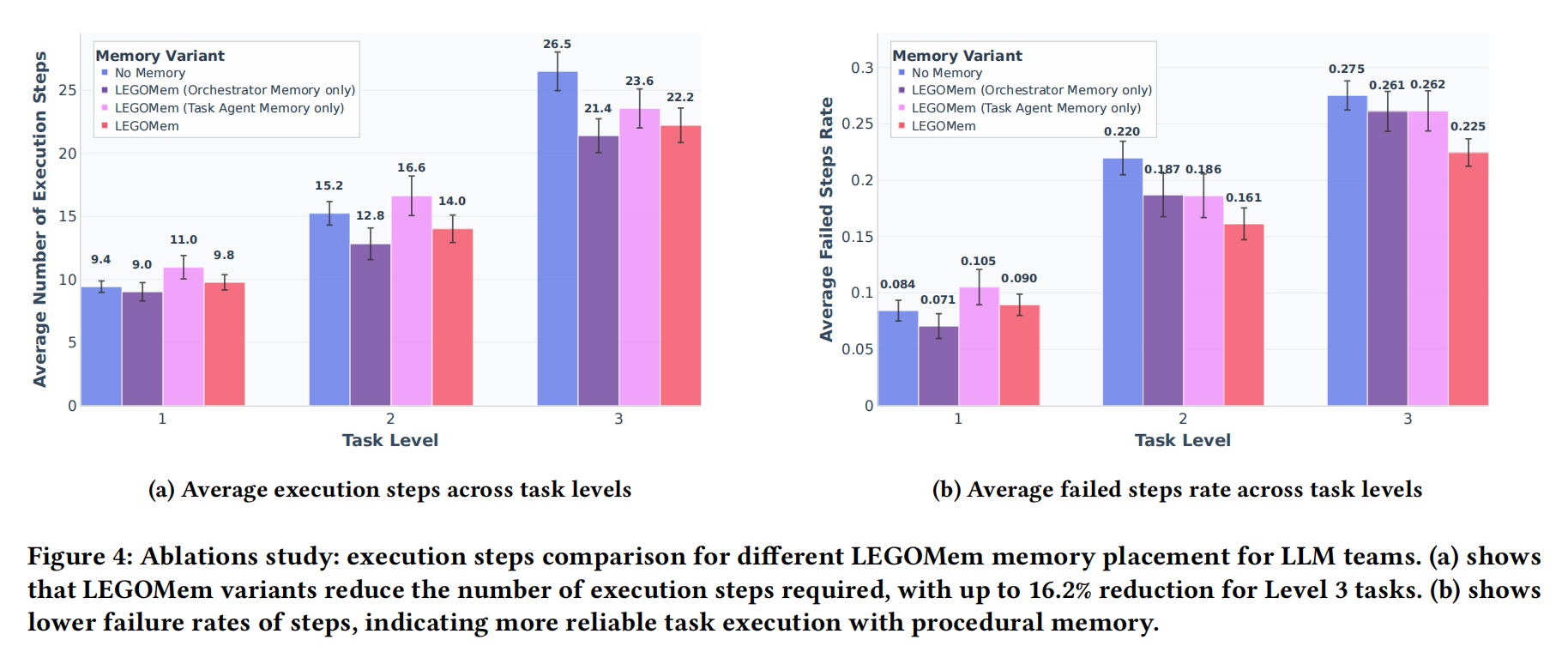 与步骤数类似,任何形式的记忆都显著降低了步骤失败率,使执行过程更加稳定可靠。仅协调器记忆 在降低失败率方面效果非常显著,而 仅任务智能体记忆 的效果相对较弱。